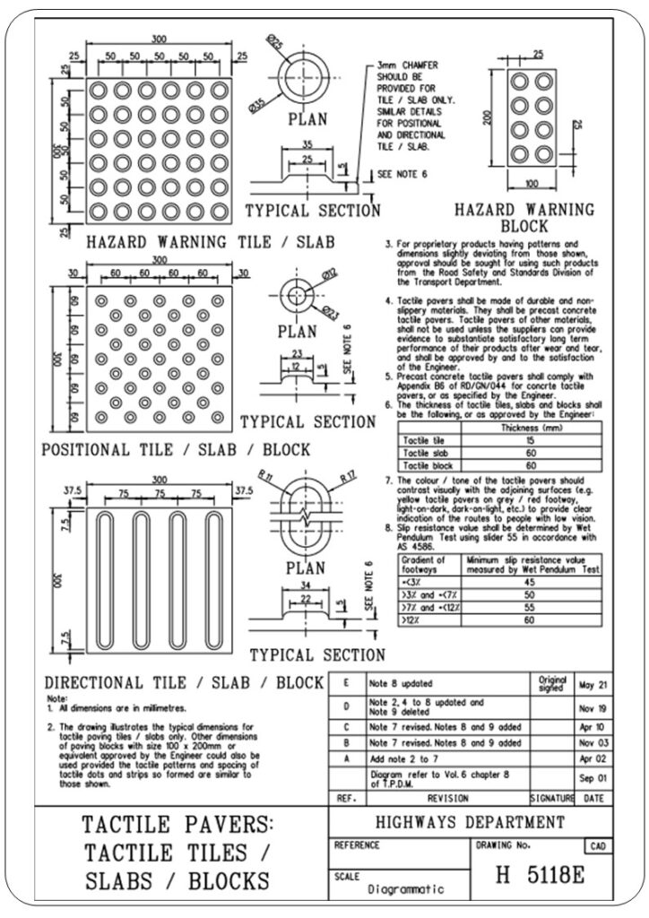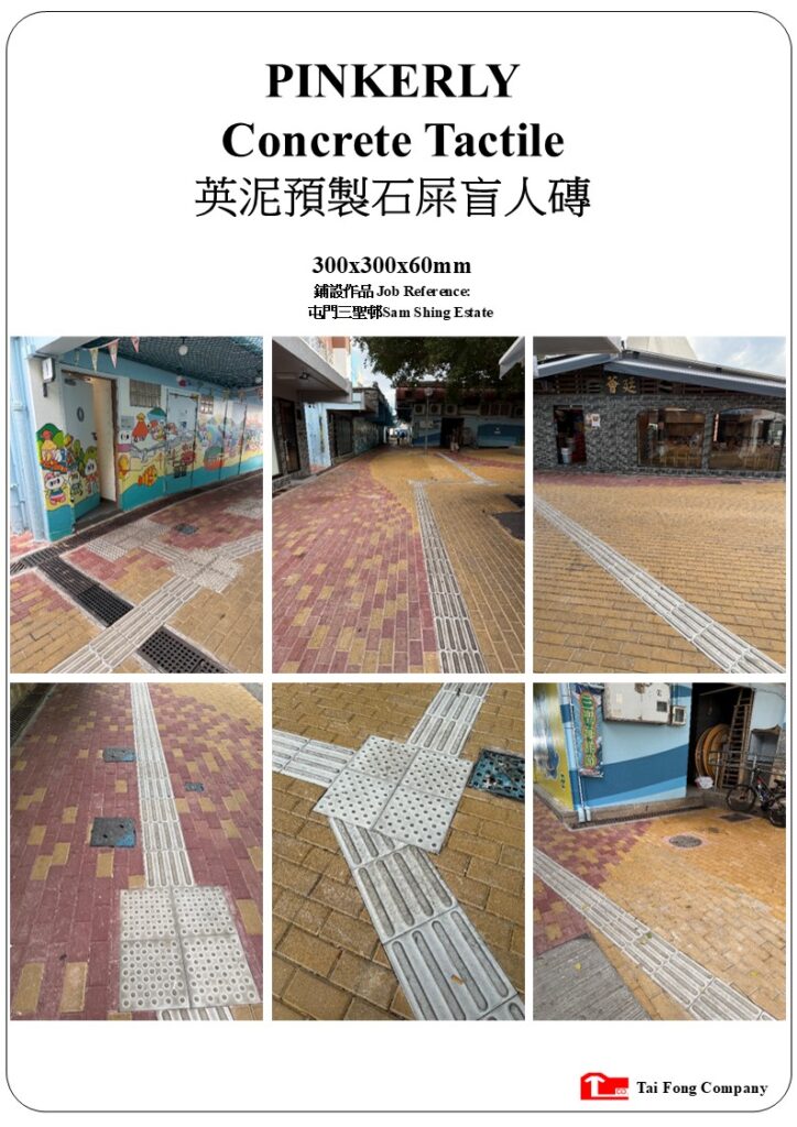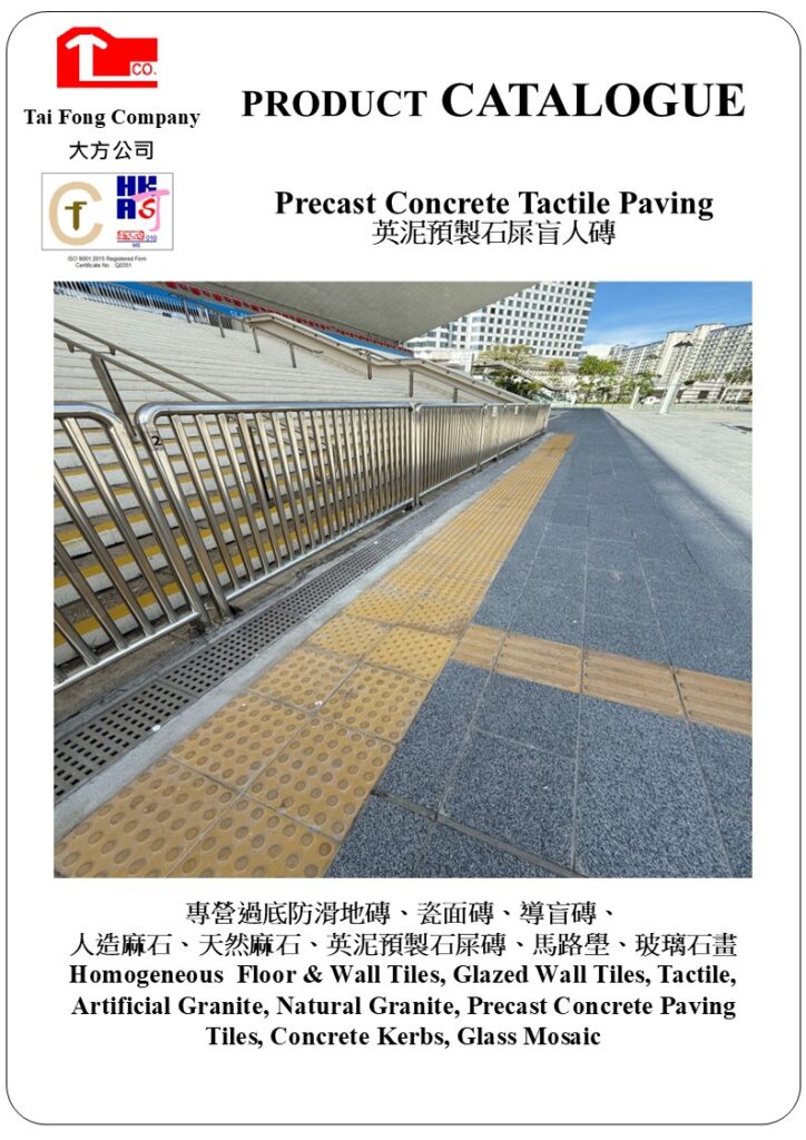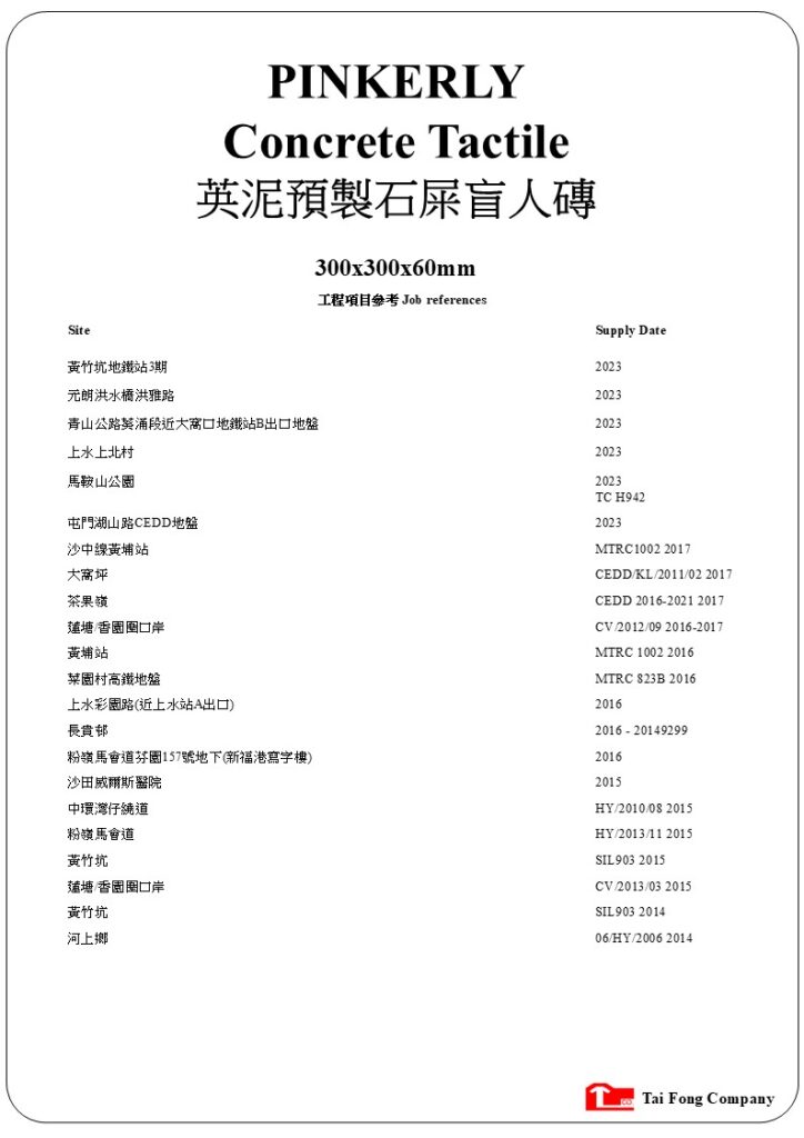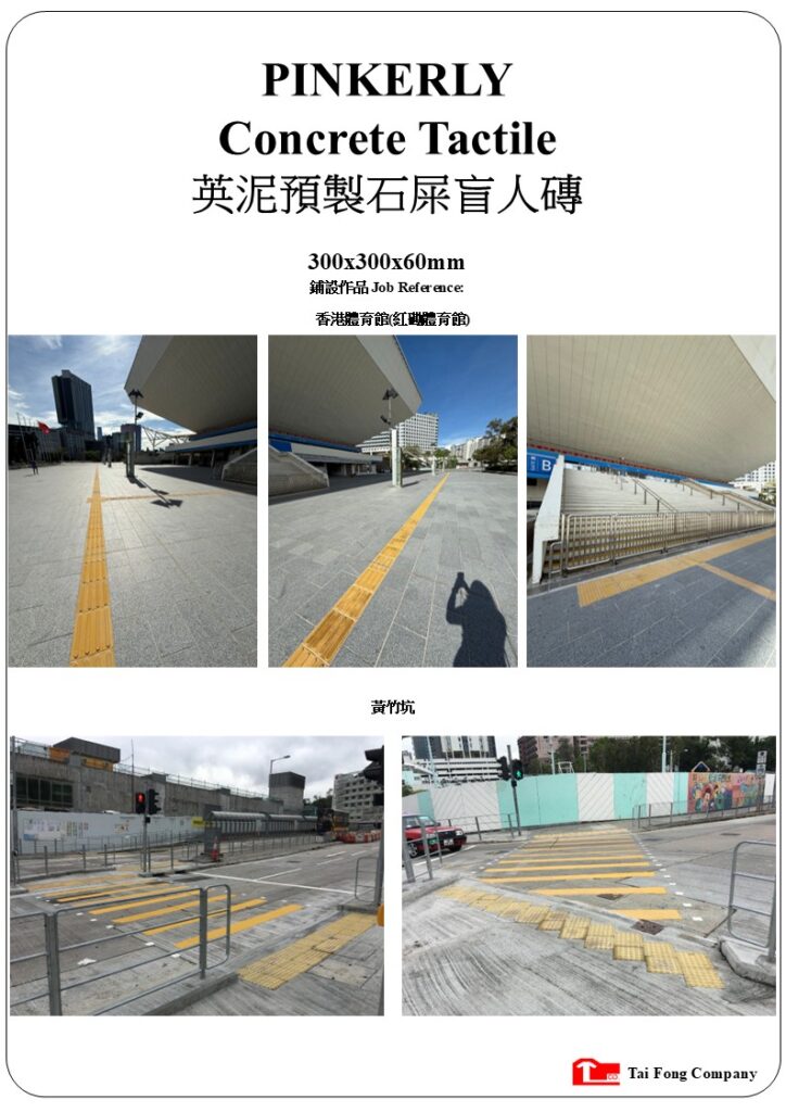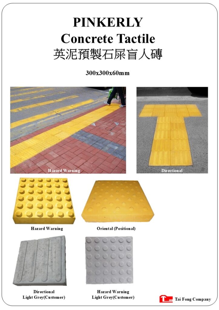 Tai Fong Company supplies 300x300x60mm precast concrete tactile paving blocks designed for visually impaired pedestrians. Our products comply with Hong Kong Highways Department Standard Drawing H 5118E and have been tested by Hong Kong Government approved laboratories, with extensive application in major government infrastructure projects.