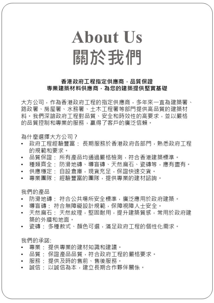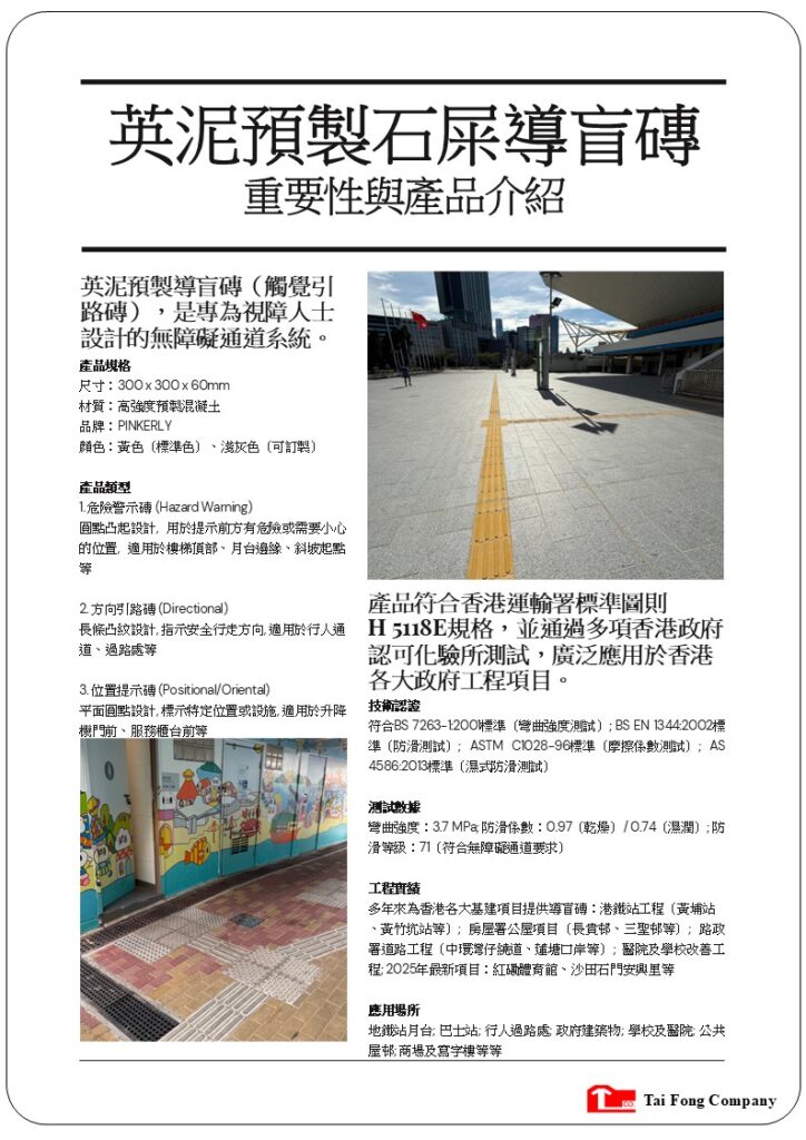 大方公司供應的300x300x60mm英泥預製導盲磚(觸覺引路磚),是專為視障人士設計的無障礙通道系統。產品符合香港運輸署標準圖則H 5118E規格,並通過多項香港政府認可化驗所測試,廣泛應用於香港各大政府工程項目。