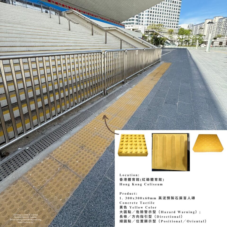 【工程案例分享|紅磡體育館】 大方公司為香港體育館(紅磡體育館)提供高品質的300x300x60mm 英泥預製石屎盲人磚,進一步完善場館的無障礙設施,為視障人士提供安全、便利的通行體驗。 項目地點 香港體育館 (紅磡體育館) Hong Kong Coliseum 【產品特色及規格】
