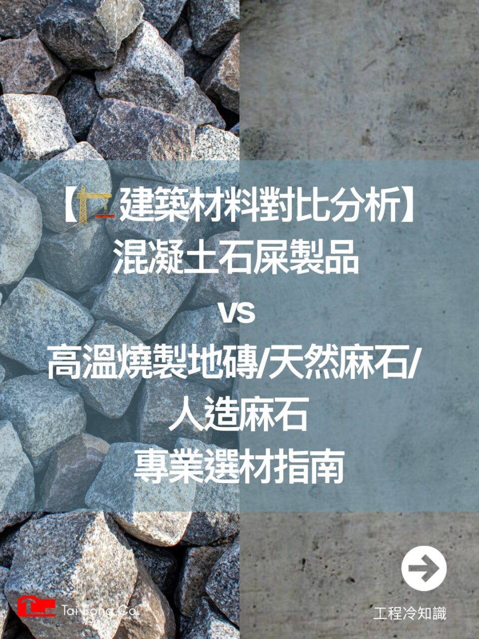 【建築材料完全指南】從混凝土到石材,專業對比分析 作為專業建材供應商,太方公司為您深入剖析各類建築材料的性能對比,助您做出最佳選擇! 第一部分:混凝土石屎製品 vs 高溫燒製地磚/天然麻石 混凝土優勢: 太陽反射指數(SRI):82-83 防水性能優異(無滲漏) 價格經濟實惠