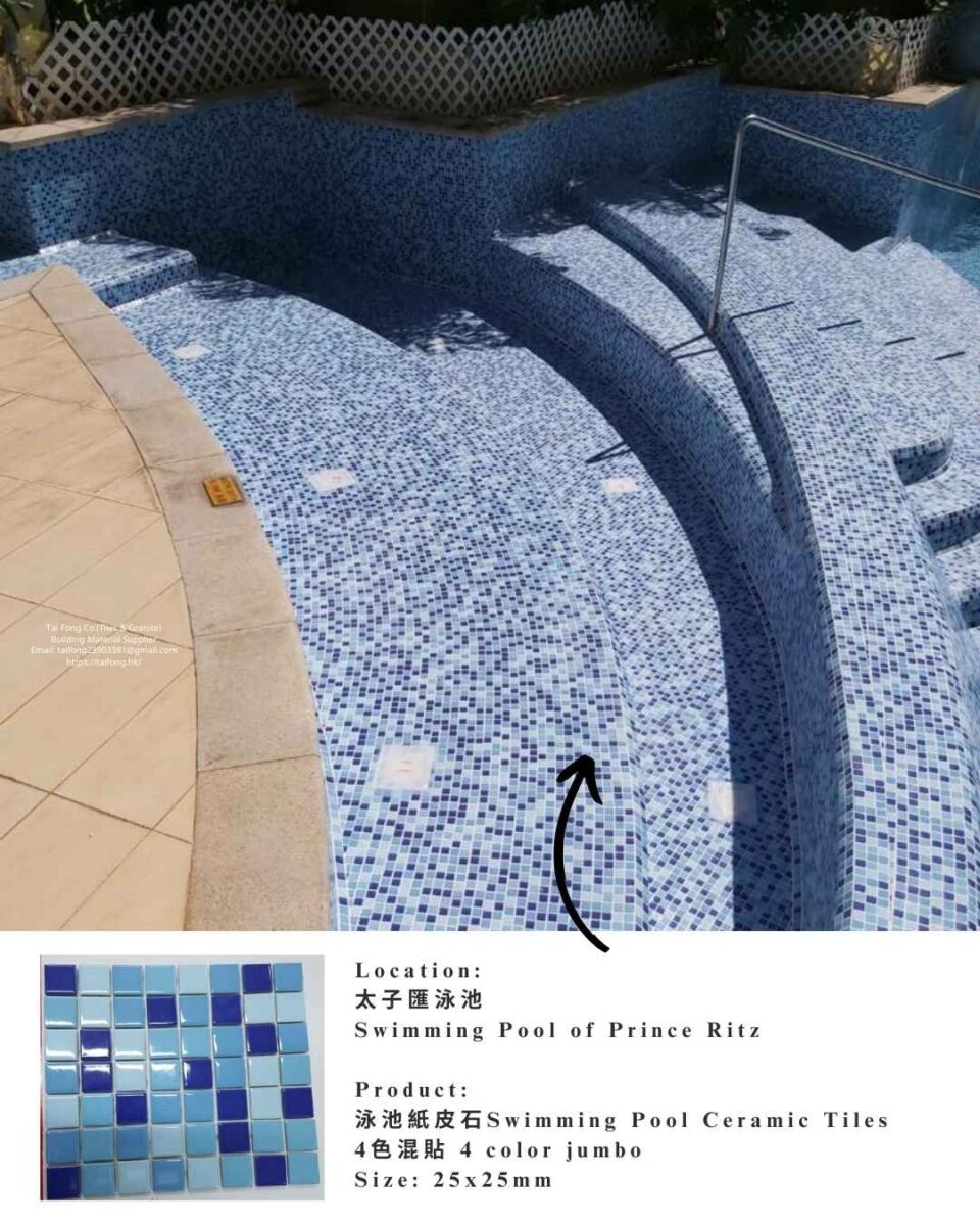 工程案例展示 📍 項目資料 地點: 太子匯泳池 Swimming Pool of Prince Ritz 產品: 泳池紙皮石 Swimming Pool Ceramic Tiles 規格: 4色混貼 4 Color Jumbo Mix 尺寸: 25x25mm 產品認證資訊